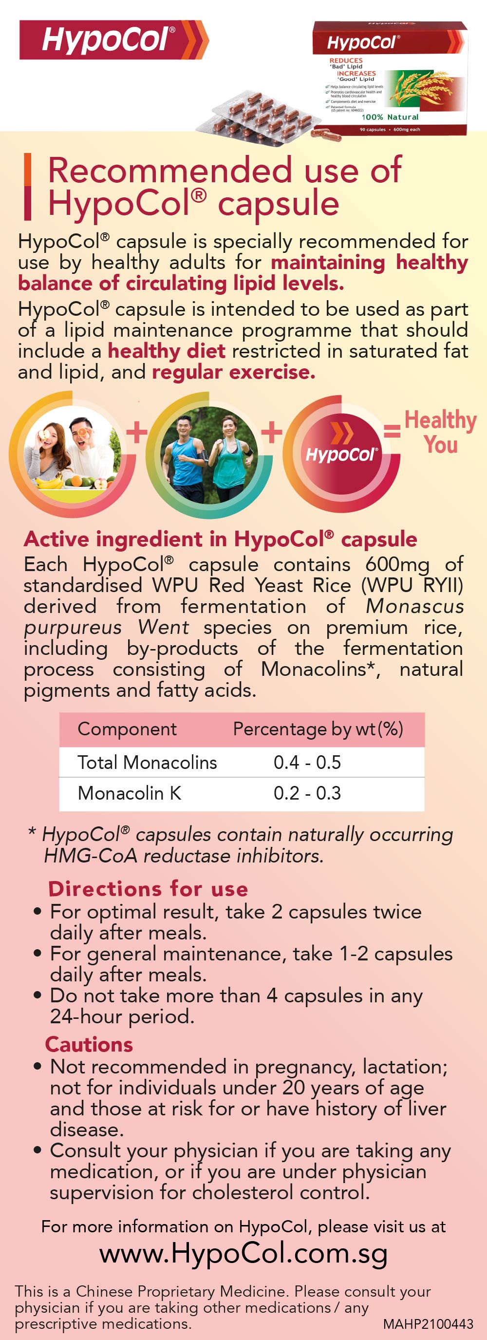 HypoCol® capsule is intended to be used as part of a lipid maintenance programme that should include a healthy diet restricted in saturated fat and lipid, and regular exercise.