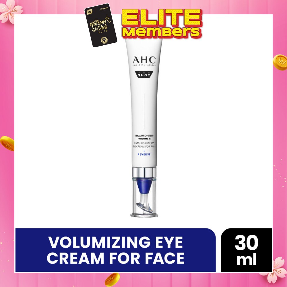 AHC PRO SHOT HYALURO-DEEP VOLUME 5 CAPSULE-INFUSED EYE CREAM FOR FACE 30ML uses 5D HA FILL TECHNOLOGY inspired by professional corrective treatments to re-volumize skin with deep moisture + Professional spoon-shape metallic DE-PUFF/PLUMP applicator. It contains BARRIER HA film-like structure, CHARGED HA moisture-adhesive structure, MACRO HA maximum 20-layer molecular structure, MICRO HA microscopic structure, DEEP HA resistant structure, PRO VIT B5 1% to strengthen skin barrier. It's enriched with HA CAPS 2% + CAFFEINE CPX to moisture re-plump apple-cheeks and de-puff around the eye area. It's also non-comedogenic tested