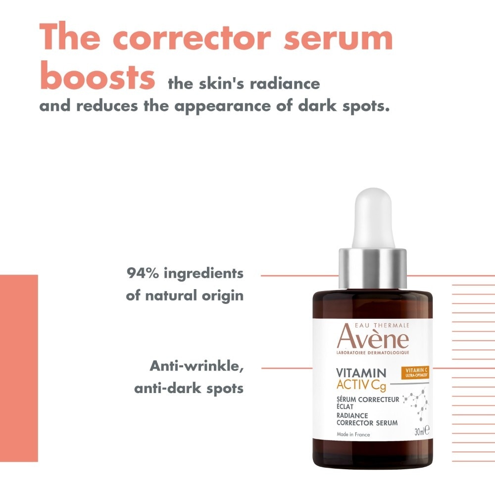 The Vitamin Activ Cg radiance corrector serum is a product tested on sensitive skin, containing 94% ingredients of natural origin, without ingredients of animal origin, in a glass pipette bottle.