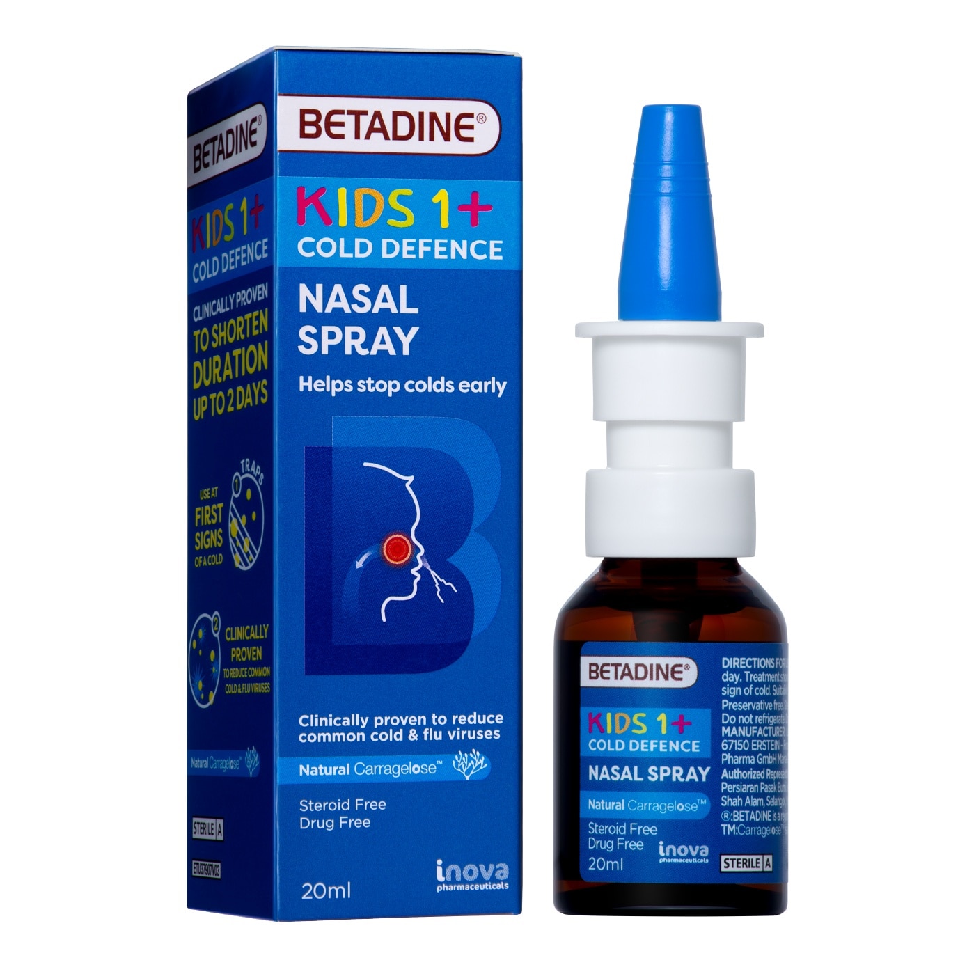 Betadine Cold Defence Kids Nasal Spray is an easy to use nasal spray clinically proven to fight against cold and flu viruses. Its ingredient Carragelose is Natural, steroid free, and drug free. Clinically proven to shorten duration of cold and flu-like symptoms by 2 days. It can help reduce the severity of symptoms and shortens the duration of a cold or flu. Help to moisten the nasal lining to protect it from dryness and injury. Targets the area in the nasal cavity where cold and viruses first take hold and multiply. Clinically proven to eliminate 99% of common cold and flu viruses and reduces chances of recurrence of cold and flu. Non drowsy and non-addictive product. Can be used during pregnancy or lactation under the advice of your doctor. It has a unique filter system that allows preservative free and in-use stability for up to 1 year after opening