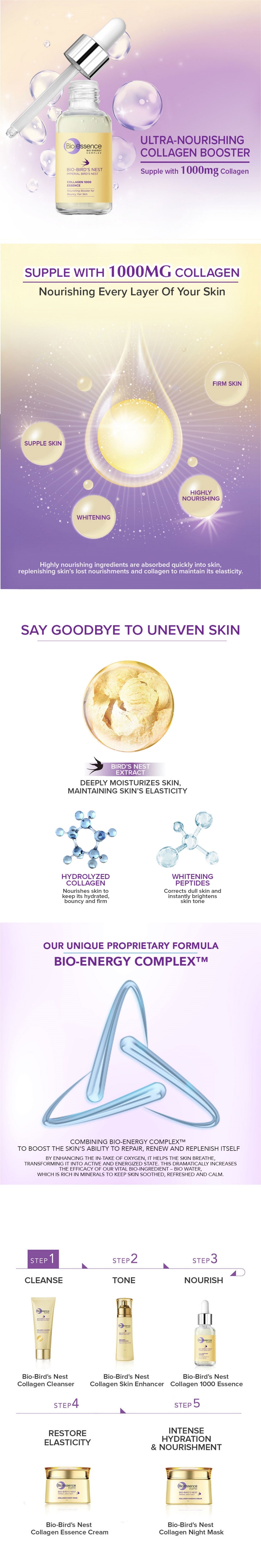An ultra-nourishing collagen booster, Bio-Bird’s Nest Collagen 1000 Essence further boosts skin’s collagen intake to maintain and improve skin’s elasticity and suppleness. Packed with 1,000mg of Hydrolyzed Collagen, it rapidly nourishes skin with essential minerals for visibly supple and fair skin. Infused with Bio Energy ComplexTM to boost delivery and absorption of nourishment and collagen to skin to keep it moisturized and supple. Formulated with 1,000mg of Hydrolyzed Collagen that intensively moisturizes skin, helping to prevent early signs of aging. Enriched with Bird’s Nest Extract that rapidly replenishes skin with lost nourishment while helping to maintain skin elasticity. With Whitening Peptides to help restore skin’s natural radiance for a fairer complexion