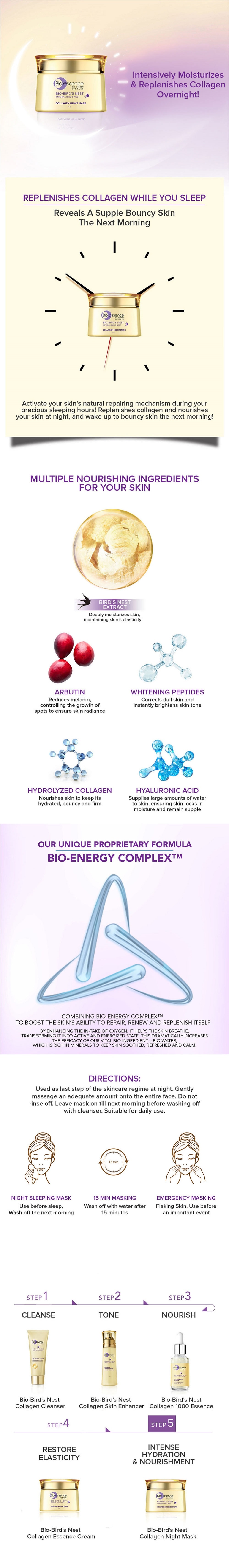 Night time is the most effective period for skin to absorb nourishments to renew and repair itself. Bio-Bird’s Nest Collagen Night Mask intensely moisturizes and replenishes collagen which skin lost over the day, maintaining skin’s bouncy touch the next morning! Infused with Bio Energy Complex™ to boost delivery and absorption of nourishments and collagen to skin for optimal skin renewal over the night. With unique memory-gel texture and rich in Bird’s Nest Extract and Hydrolyzed Collagen, to replenish skin with the required nutrients to keep skin moisturized and bouncy. Contains whitening peptides to help maintain a fair-looking skin.
