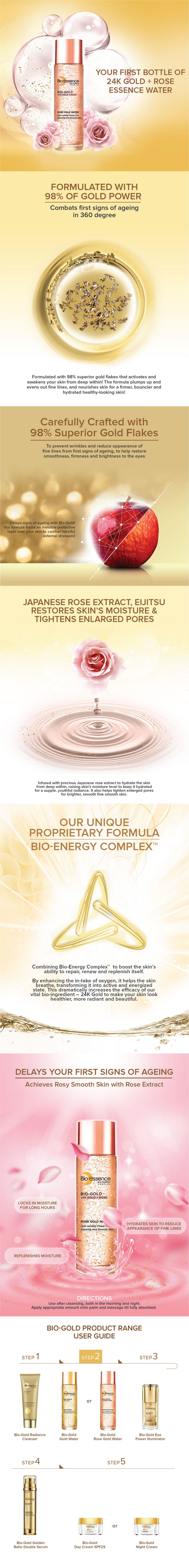 Infused with Bio Energy Complex™, Bio-Gold Rose Gold Wateris thus better delivered into skin to reduce the appearance of fine lines, and amply hydrate skin for a smooth texture. Helps tighten enlarged pores, and regulates moisture and sebum balance for fine and smooth skin.