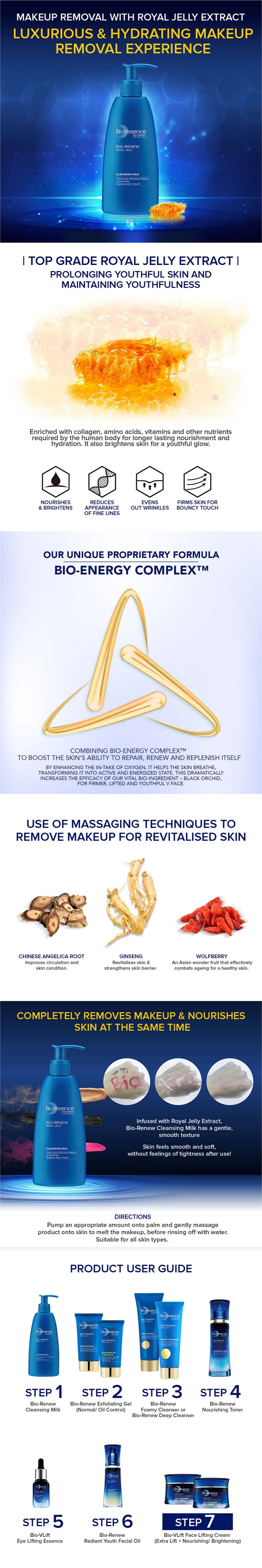 Infused with Bio Energy Complex™ to help rejuvenate and refresh skin upon cleansing. Bio Essence Bio Renew Cleansing Milk effectively and thoroughly removes all traces of makeup and impurities without stripping skin off its natural moisture. Lightweight, creamy texture with Royal Jelly to nourish skin while cleansing, leaving skin soft and smooth after wash. Gentle formula for face and neck areas