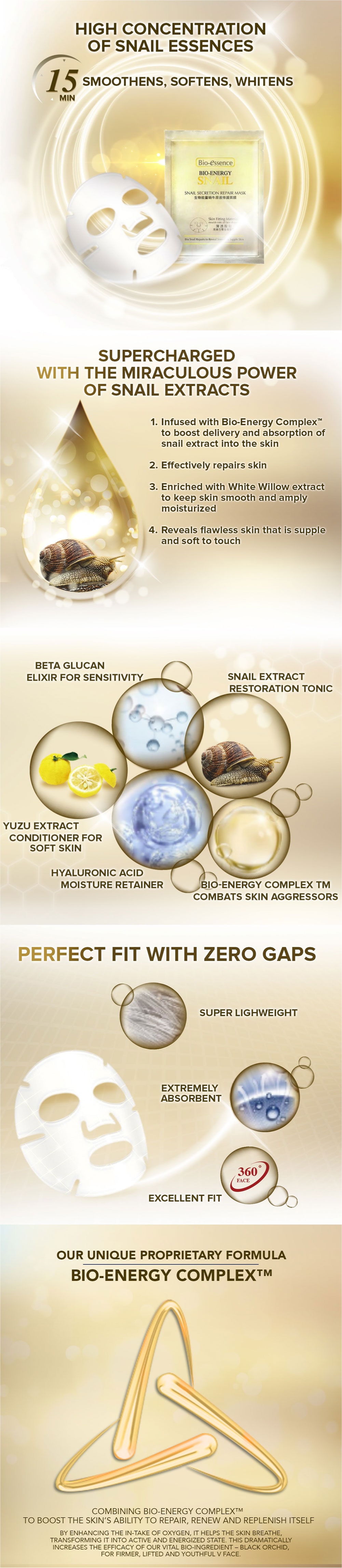 Bio-Snail Repairs Mask is infused with Bio Energy Complex™ to boost delivery and absorption of Snail Extract into skin to enhance the effectiveness of skin's repairing process. It it enriched with White Willow Extract, which helps to keep skin smooth and amply moisturized, revealing flawless skin that is soft and supple to the touch.