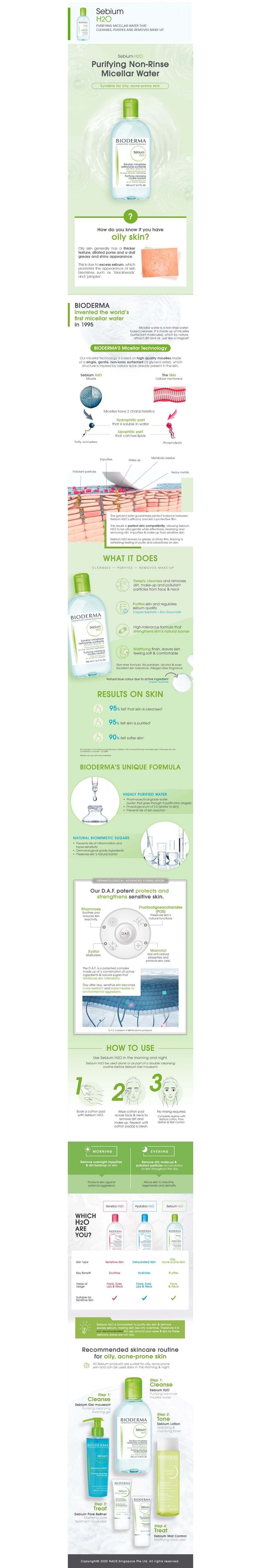 - Avoid using Sebium H2O around/on eyes and lips area. Our eyes and lips are not oily and much more delicate compared to other areas of our face. Sebium H2O will not work for these areas, as it is primarily formulated to remove excess sebum (controls shine) from face.
