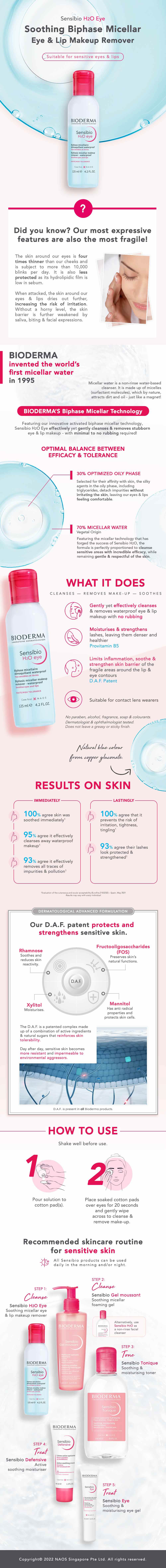 Sensibio H2O Eye features our innovative activated biphase micellar technology that effectively yet gently cleanses & removes even the most stubborn & waterproof eye & lip makeup *minimal to no rubbing required! Sensibio H2O Eye's formula is perfectly proportioned to thoroughly remove make-up, while offering maximum sensory appeal while limisting risk of irritation. It leaves skin soft, comfortable and refreshed.