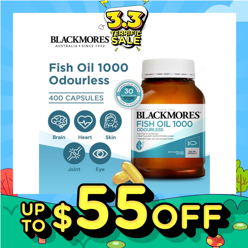 BLACKMORES Odourless Fish Oil 1000mg is an ideal supplement that provides high-quality natural source of omega-3. Contains 300mg of omega-3 per capsule and play an important role to maintain heart, skin, eye, brain health and to help reduce inflammatory response. Helps to strengthen heart function, enhance healthy brain function, promote healthy vision, promote healthy skin and promote healthy pregnancy & breastfeeding.