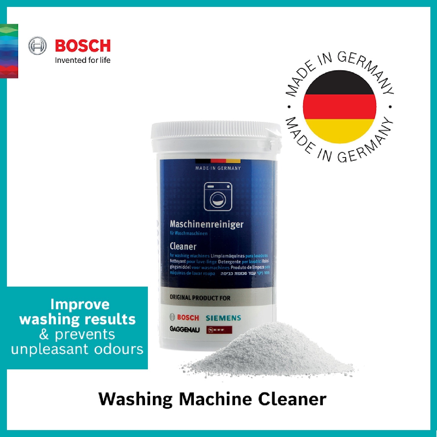 Helps to ensure a cleaner, more hygenic interior of the washing machine, which can improve washing results. Powerfully removes residue in the drum. Suitable for removing deposits from the appliance such as detergent. Helps to prevent unpleasant odours from developing.