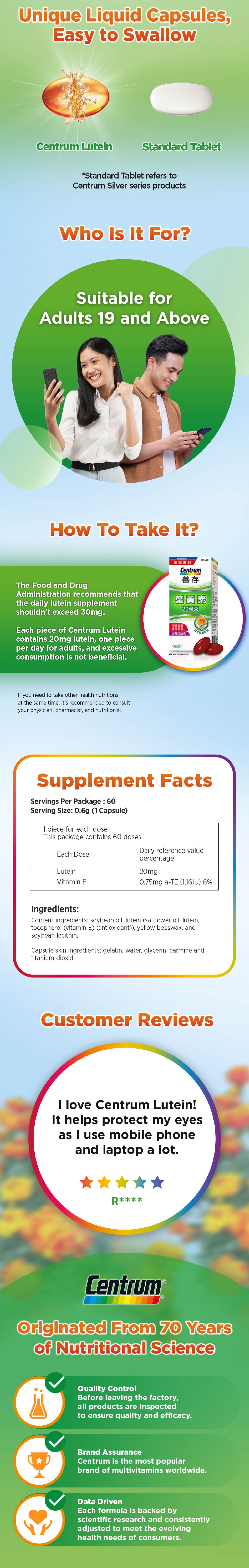 See the difference in 3 weeks with Centrum Lutein. Each tablet contains high dosage of Lutein (20mg) and provides 17% higher absorption of Lutein.
