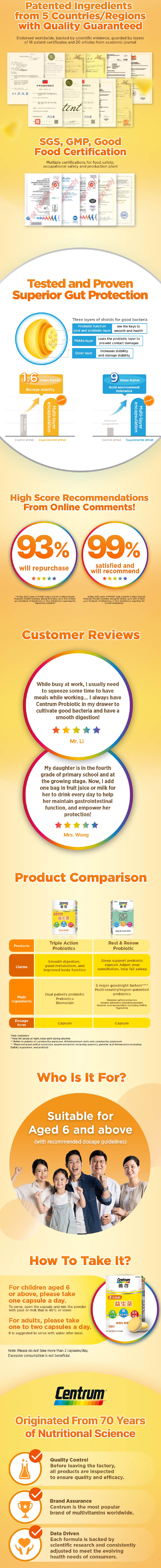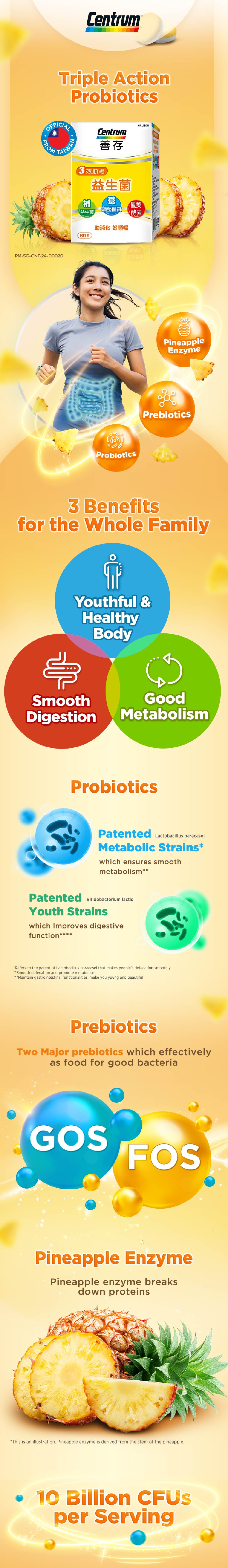 Centrum Triple Action Probiotics contains probiotics, prebiotics and pineapple enzyme that support good metabolism, improves digestion function and overall wellbeing.