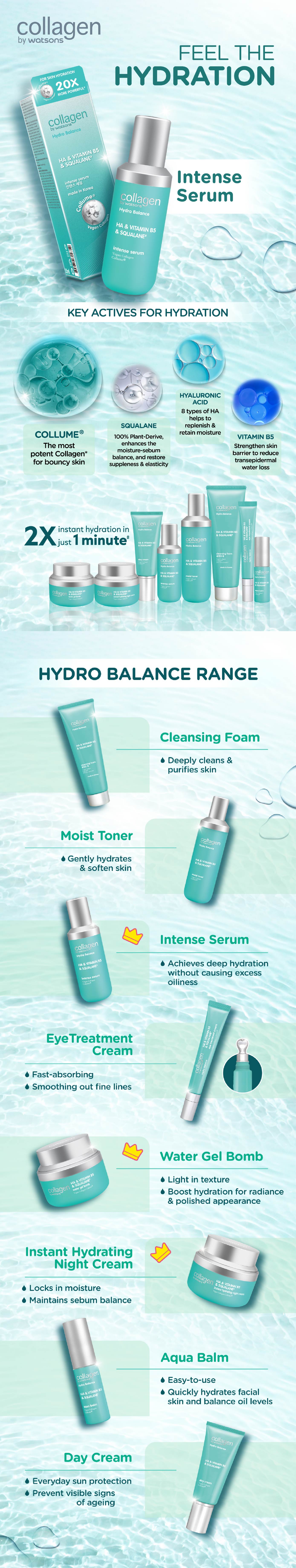 Collagen by Watson Hydro Balance isscientifically formulated for all-roundhydration that help to deeply moisturiseyour skin, restore suppleness, and increase elasticity. Its Smart WaterReplenisher technology strengthens theskin barrier and helps to maintain ahealthy moisture-sebum balance, leaving you with a nourished and energised complexion.