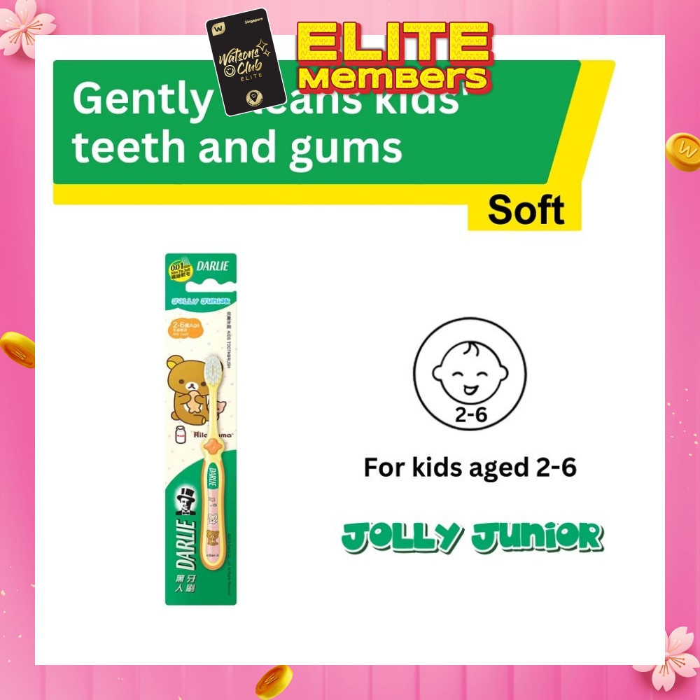 Specially designed for kids with milk teeth, Darlie Jolly Junior (2-6 years old) toothbrush comes with ultra compact head suitable for kids with smaller oral cavity to clean hard-to-reach area. The soft bristles gentle to kids' tender gums make brushing a breeze.0.01mm slim tip soft bristles could gently clean and care kids mouth.Approximately 20mm ultra compact head. Specially designed for kids with milk teeth. Anti-slip soft grip handle that fits handshape of kids for comfortable grabbing.