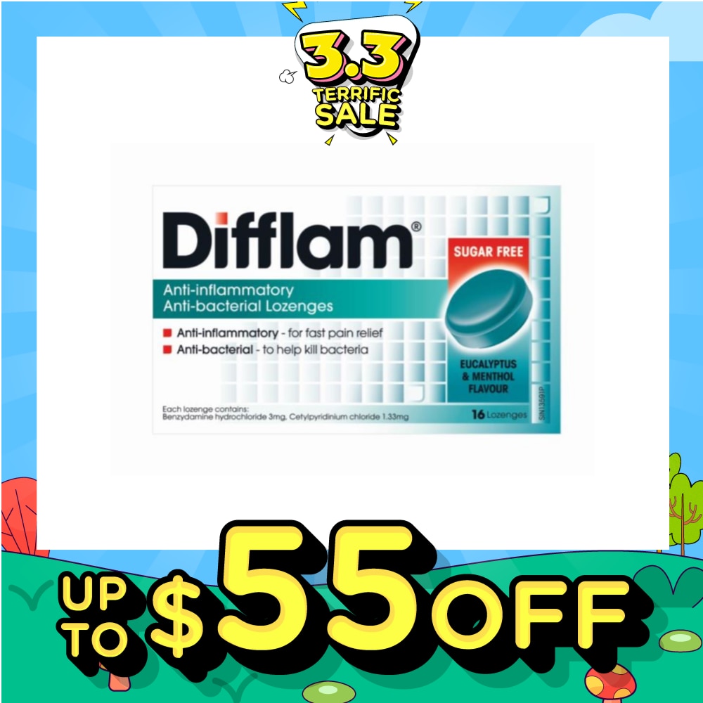 Difflam Anti-Inflammatory Anti-bacterial Eucalyptus&Menthol Sugar Free Lozenges contain active ingredients, Benzydamine HCl and Cetylpyridinium Cl to relieve pain and swelling due to sore throat with infection, tonsillitis and other inflammatory conditions in the mouth and throat. Difflam is sugar free and suitable for diabetics.
