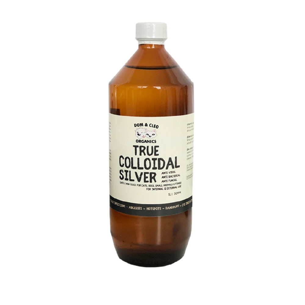 Dom & Cleo Organics True Colloidal Silver may be ingested or applied to any area of the body for disinfection and to aid healing. A must have in every pet household, Dom and Cleo Colloidal Silver works as an external antimicrobial or disinfectant for wounds, sores, bites, burns, eye and ear infections, ringworm, skin rash and gum & breath spray. To inhale, use full strength in a nebulizer or add to water in atomizing humidifiers. May be used in fresh water aquariums or applied directly to marine fishes.