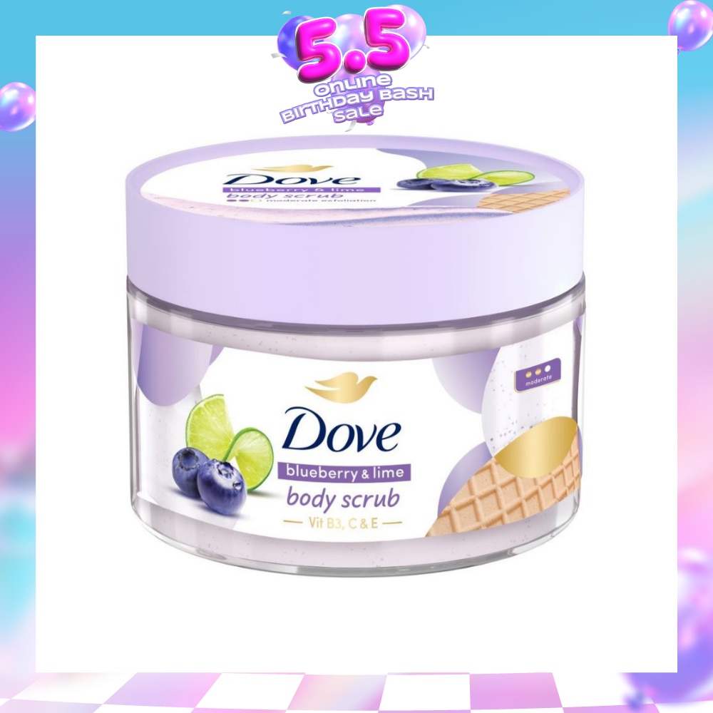 Dove Ice-cream Body Scrub for Luminous Glowing Skin Blueberry & Lime Triple Vitamins 280G, with moderate exfoliation strength to help remove dead skin cells, revealing skin's softness and radiant glow.. It also contains Glycerin to replenish skin moisture and 1/4 moisturising cream to deeply nourish skin.