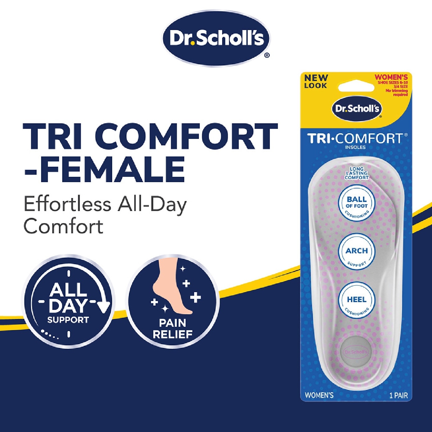 Dr. Scholl’s® Tri-Comfort® Insoles are designed for people whose feet experience discomfort during the day. These insoles are meant to provide added comfort with targeted cushioning to your ball of foot, arch and heel. Help your feet feel great with long lasting comfort!