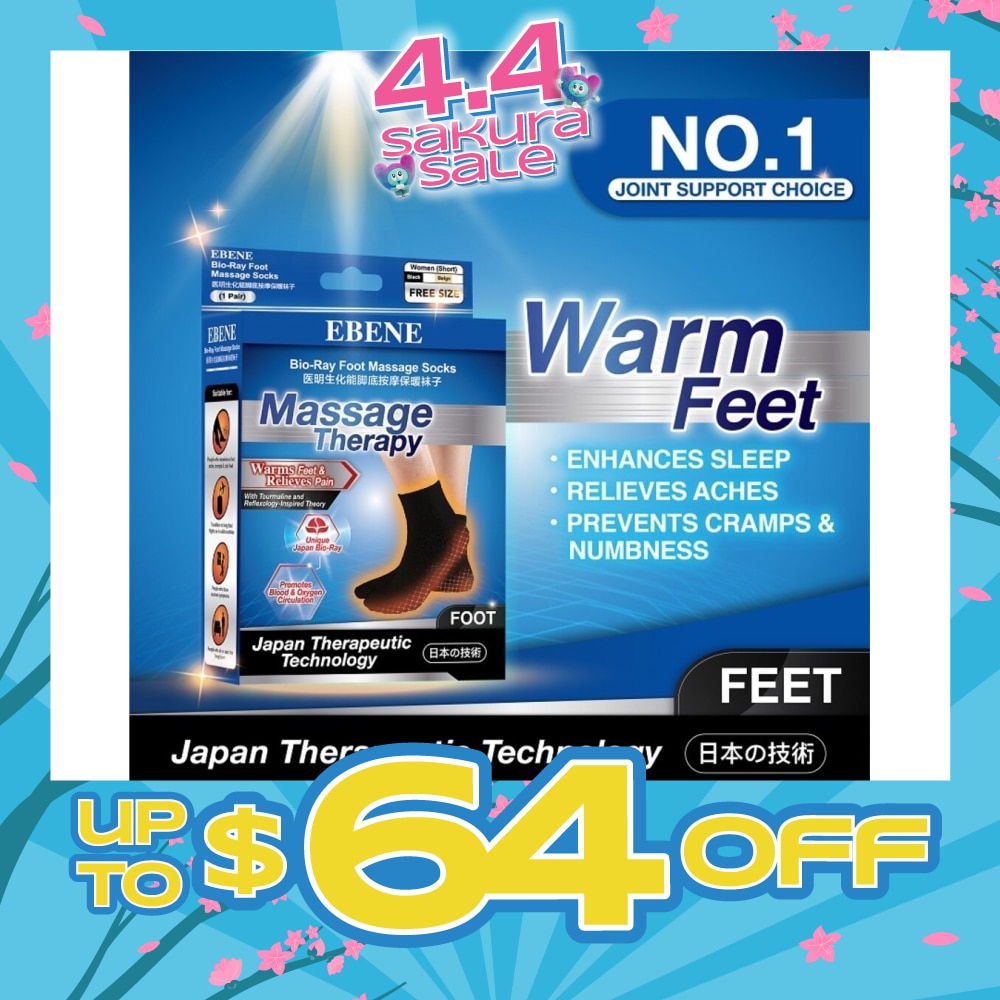 Ebene Foot Massage Socks (Women's) Black work as a foot massager to promote blood & oxygen circulation in feet. Wear while sleeping at night to help keep body warm & prevent leg cramps, helps relieve stress & tiredness of feet after long hours of walking or standing, provide energy to increase running speed during exercise, helps to prevent foot & shoe odour, helps relieve nocturia problems
