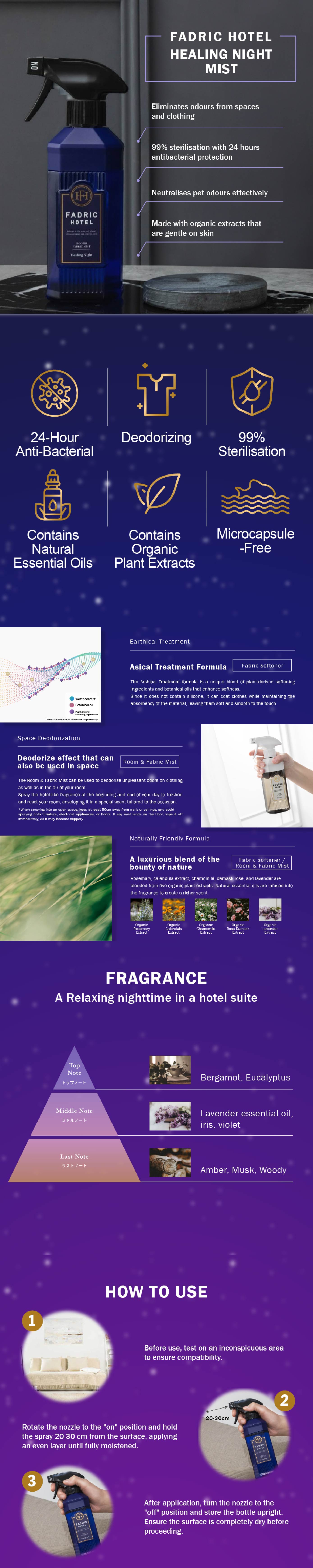 FADRIC HOTEL Healing Night Mist brings the elegance of luxury hotel suites to your space, promoting restful sleep through a calming blend of lavender and amber. This Room & Fabric Mist effectively neutralizes odors while infusing a soothing fragrance. With 24-hour antibacterial protection, it sterilizes 99% of unwashed fabrics, ensuring a clean and inviting environment.