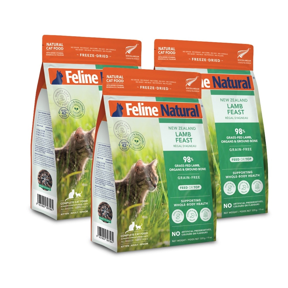 Our complete and balanced Freeze-Dried New Zealand Lamb Feast contains 98% Grass-fed & Grass-finished Lamb & Organs, with New Zealand Green Mussels, Flaxseed Flakes, Kelp, Vitamins, Minerals and Taurine in support of your cat's whole-body health.