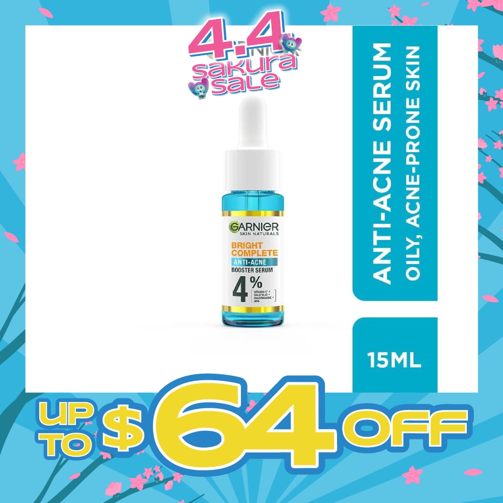 New Garnier Bright Complete Anti Acne Booster Serum powered with 4% Vitamin C + Salicyclic + Niacinamide + AHA, helps to fight acne and fade dark spots. Skin is soothed, visibly brighter and clearer.