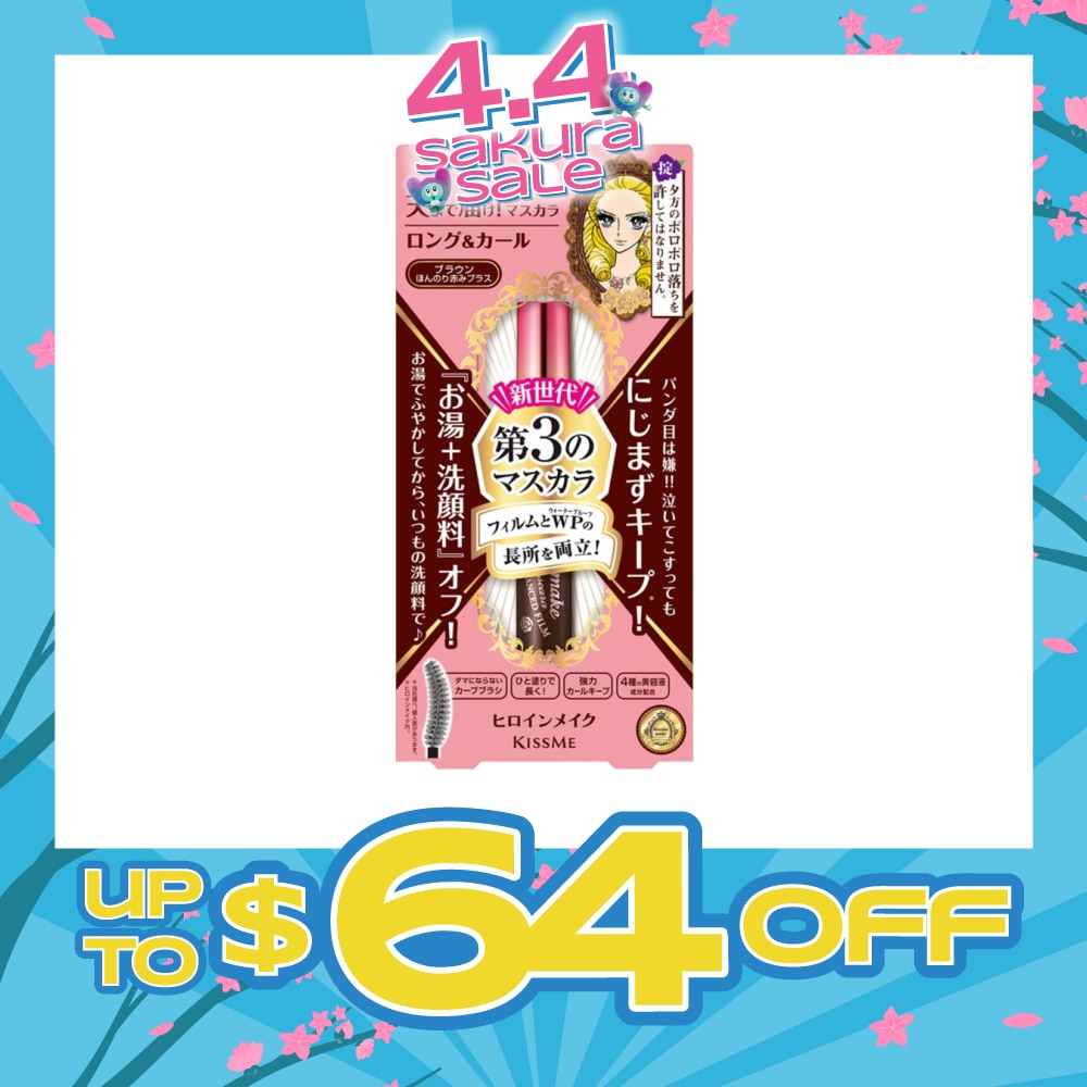 Kiss Me Heroine Make Long & Curl Mascara Advanced Film #02 Brown lifts your lashes to even greater heights! Contains water & sebum-resistant ingredients, mascara is smudge-proof all day yet removable with less tugging. It has a no-clump curved brush that is specially shaped to fit the natural curve of Asian eyes to ensure that every lash is coated and curled! Film mascara has the same lengthening effect but removes easier compared to super waterproof mascaras. Great for everyday use!