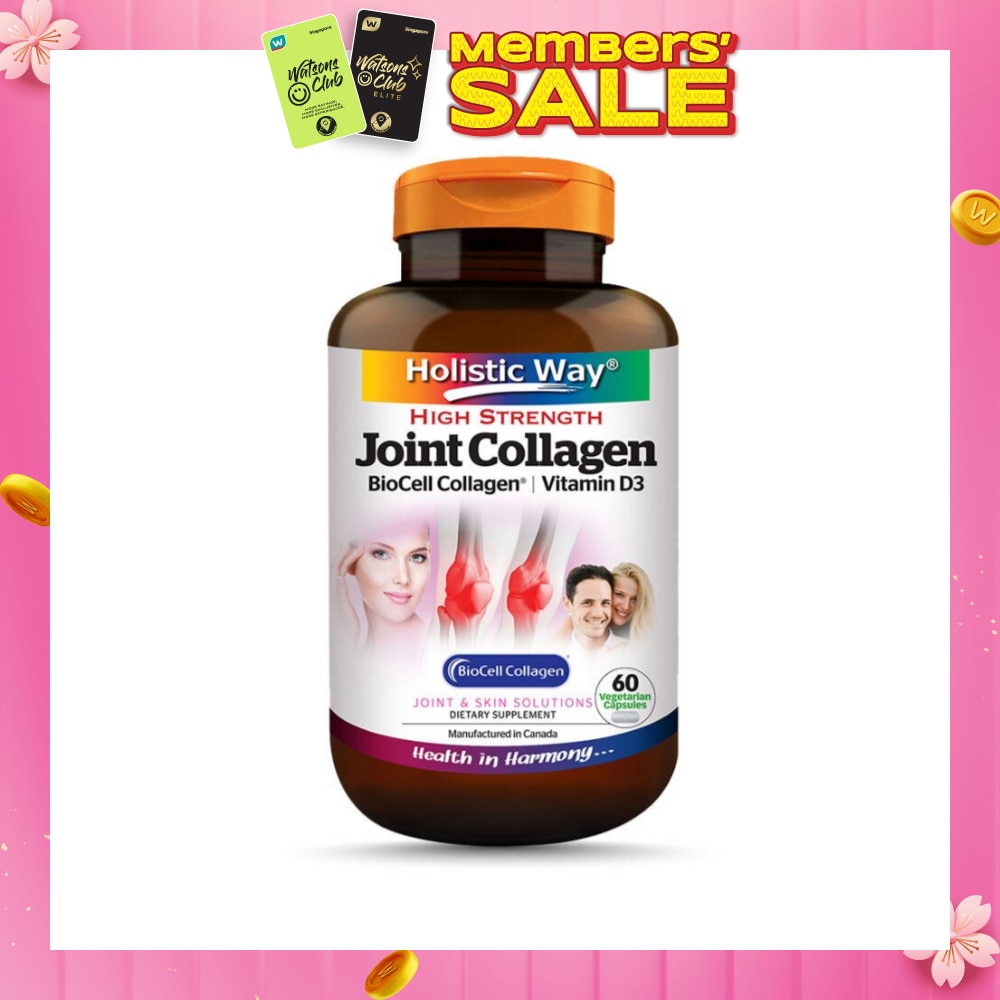Holistic Way High Strength Joint Collagen is specially comprised of BioCell Collagen® and Vitamin D3. This highly bioavailable combination may play an essential role towards the health of cartilage, synovial fluid, tendon, ligament and skin. BioCell Collagen® is made up of hormone and antibiotic free chicken sternal cartilage. It mirrors human articular cartilage and contains a patented composition of naturally occurring Hydrolyzed Collagen Type II, glycosaminoglycans (GAGs) as Chondroitin Sulfate and Hyaluronic Acid in a highly absorbable matrix form for the comprehensive maintenance of healthy joint function. Hydrolyzed Type II Collagen is the most abundant protein in cartilage which may help to stimulate chondrocytes for the formation and regeneration of new collagen. Hyaluronic Acid is the key structural molecule to form healthy and functional cartilage. It may act as the major component of synovial fluid or lubricant that allows for smooth and easy movement. Chondroitin Sulfate may act as shock absorbing molecule in promoting joint health. BioCell Collagen® is beneficial on skin health which may help to promote healthy skin texture, support skin integrity and healthy blood microcirculation in the face.