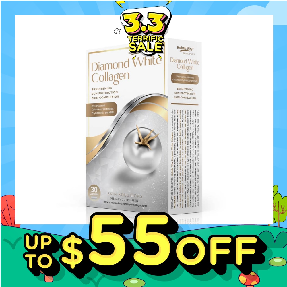 Holistic Way Premium Gold Diamond White Collagen is a comprehensive All-in-One formula containing PhytoflORAL®, a proprietary ingredient derived from non-GMO tomatoes. Rich in carotenoids such as Phytoene and Phytofluene, it may help support brightening of skin, apart from helping to support body’s natural response towards UV exposure and provide essential sun protection. Added with Hydrolysed Marine Collagen and L-Glutathione, it may help support skin hydration, skin health and complexion. Polypodium leucotomos is a type of topical fern which helps support body’s natural response towards UV exposure and provide essential sun protection. The comprehensive formulation also consists of Nicotinamide Mononucleotide (NMN), a cellular energy precursor and various antioxidants that may assist in energy metabolism and overall skin health. Suitable for both men and women to support skin integrity from within.