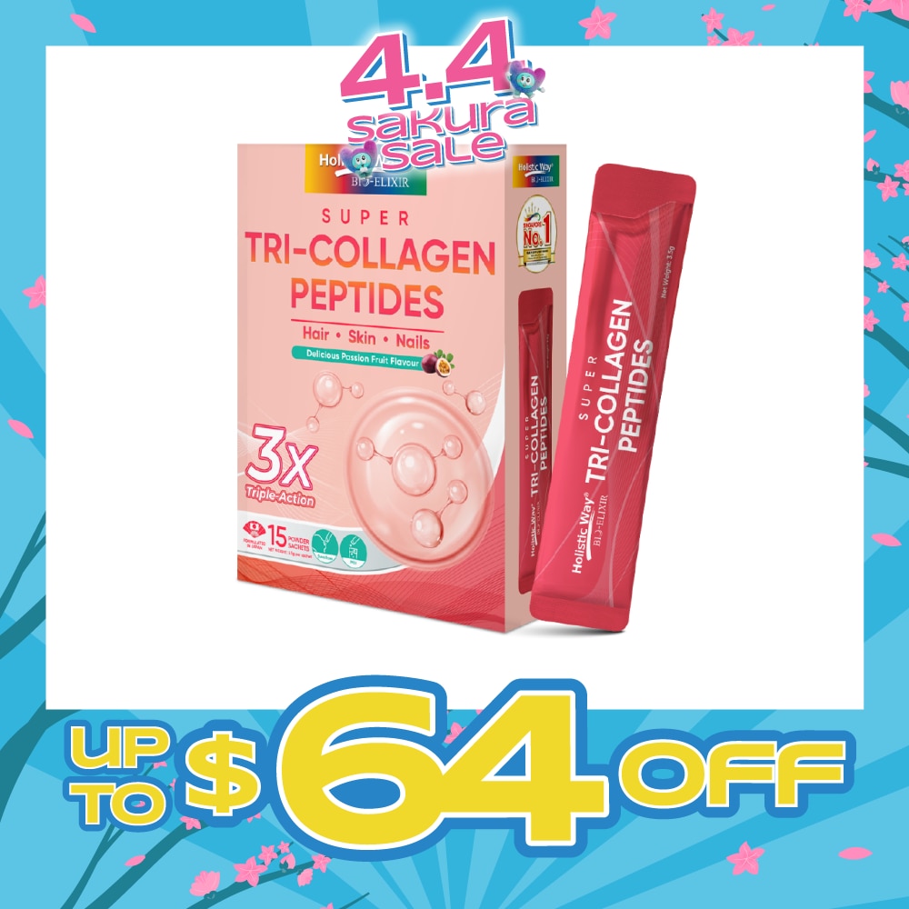 Holistic Way Super Tri-Collagen Peptides features the smallest molecules, Japan Collagen Dipeptide and Korea Collagen Tripeptide, for direct absorption without the need for further digestion. Enriched with natural silk peptide and rice ceramide, it provides essential building blocks for a healthy skin barrier function and increases water-retaining ability for hydrated skin. Regular consumption supports optimal skin glow, hair quality, and nail strength.