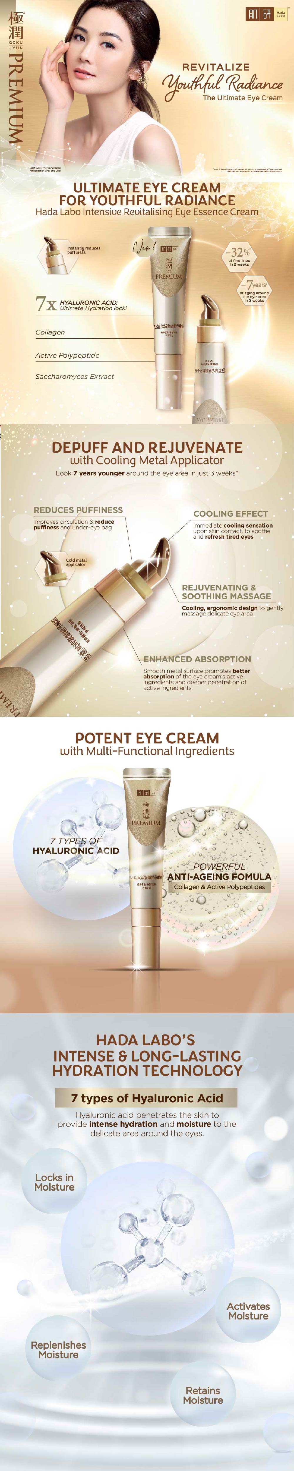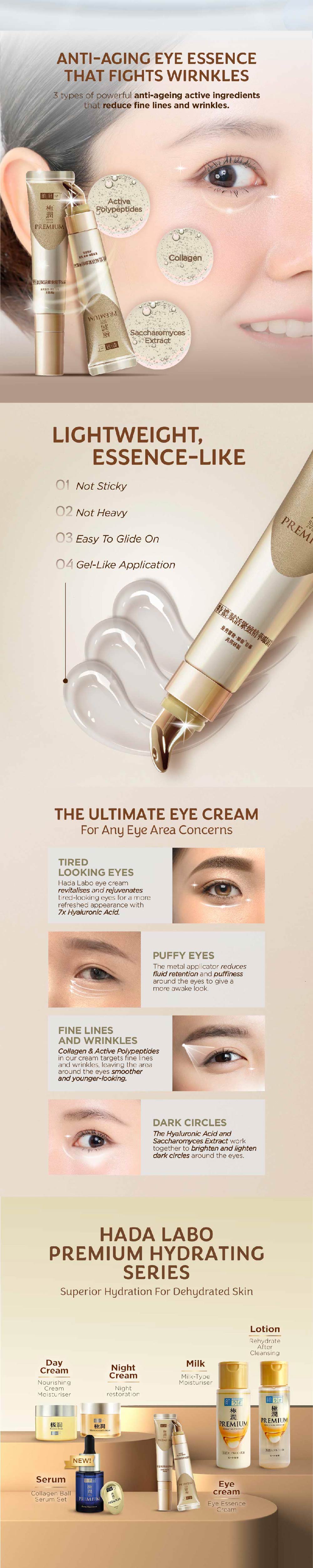 Hada Labo Intensive Revitalizing Eye Essence Cream, is infused with 7 types of Lyaluronic Acid (HA), Collagen and Active Polypeptide to deeply hydrate and improve firmness & elasticity for a supple, less puffy and more lifted look.