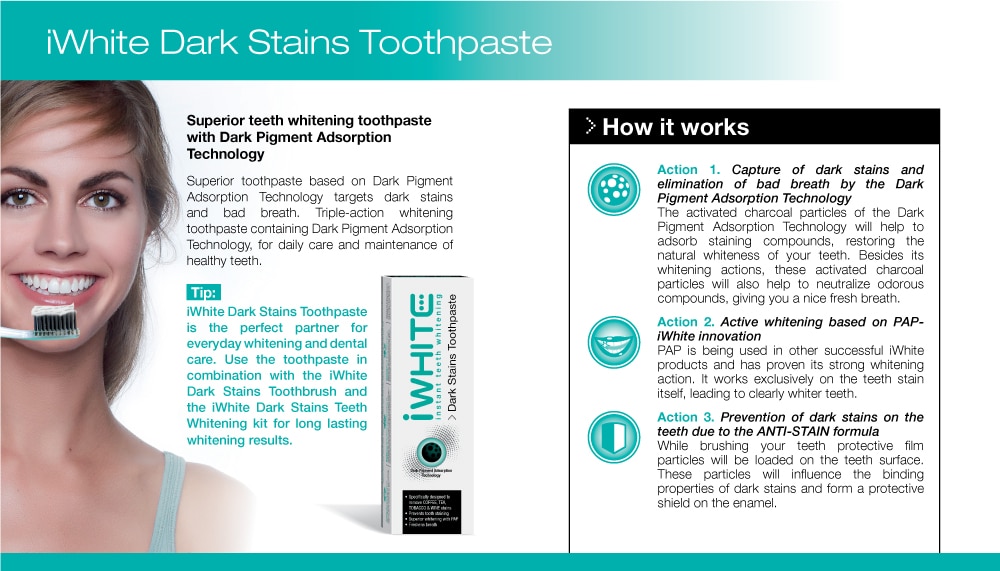 Featuring the innovative Dark Pigment Adsorption Technology, iWhite Dark Stains Whitening Toothpaste restores the natural whiteness of your teeth for a healthier, brighter smile, while neutralizing odorous compounds for a fresher breath.