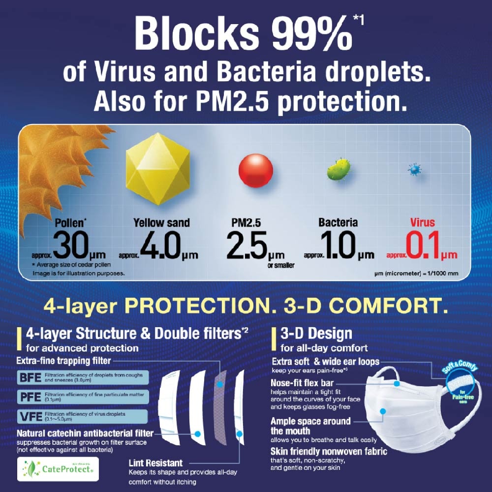 The three dimensional face mask developed from the medical perspective has a high-performance 5 layer structure of Japan’s Technology, and is capable of removing pollen, PM2.5, and virus, too.