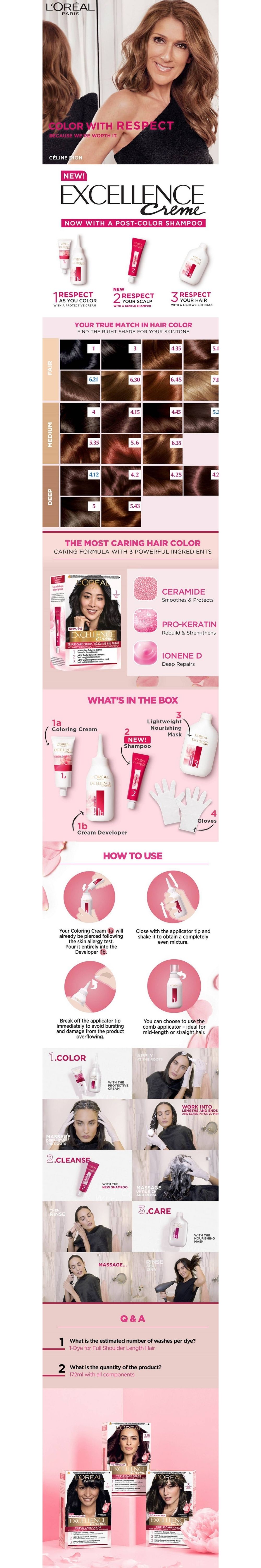 From the World’s No. 1 Hair Color brand*, L’Oreal Paris Excellence Crème offers you the utmost care for the richest color. Its unique triple care formula with pro-keratin complex & ceramide protects before, during & after coloring for 100% grey coverage & rich, radiant color.