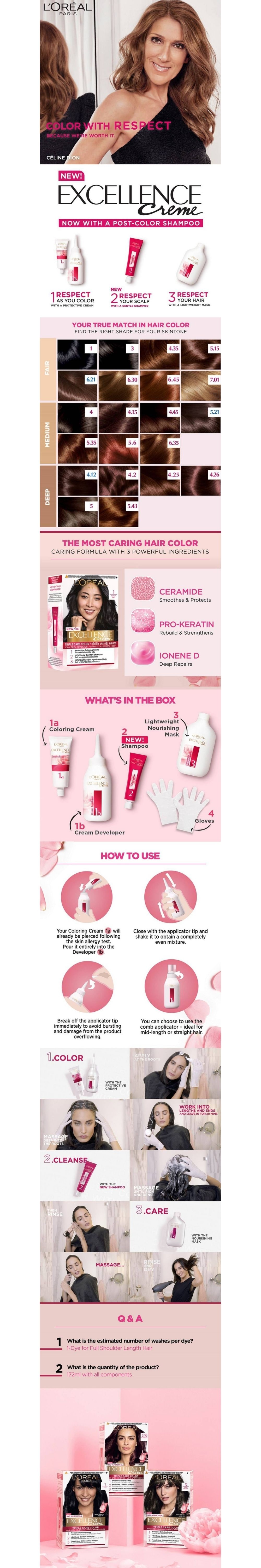 From the World’s No. 1 Hair Color brand*, L’Oreal Paris Excellence Crème offers you the utmost care for the richest color. Its unique triple care formula with pro-keratin complex & ceramide protects before, during & after coloring for 100% grey coverage & rich, radiant color.