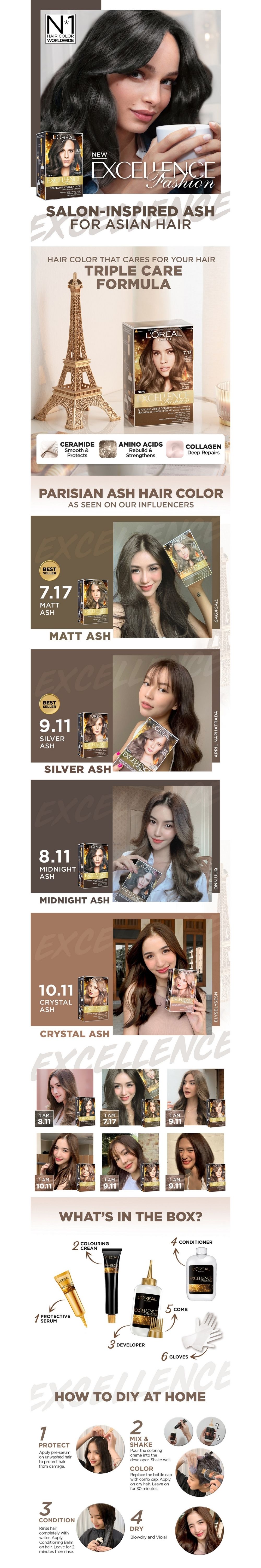PARISIAN ASH COOL COLLECTION Intensely ash shades made for dark Asian hair. This collection by L'Oreal Paris aims to bring the effortless and elusive Parisian look with perfectly cool ash, nude beige, and iridescent shades. Infused with a blend of 3 high-intensity cool pigments, the shades are brass-defying, multi-tonal cool shades that work even on dark Asian hair.