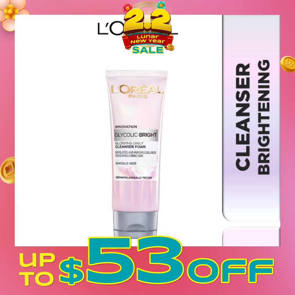 L'oreal Paris Glycolic Bright Daily Cleanser Foam with brightening Glycolic Acid exfoliates and removes dullness for even glowing skin, tested by dermatologist & proven on Asian skin tones.