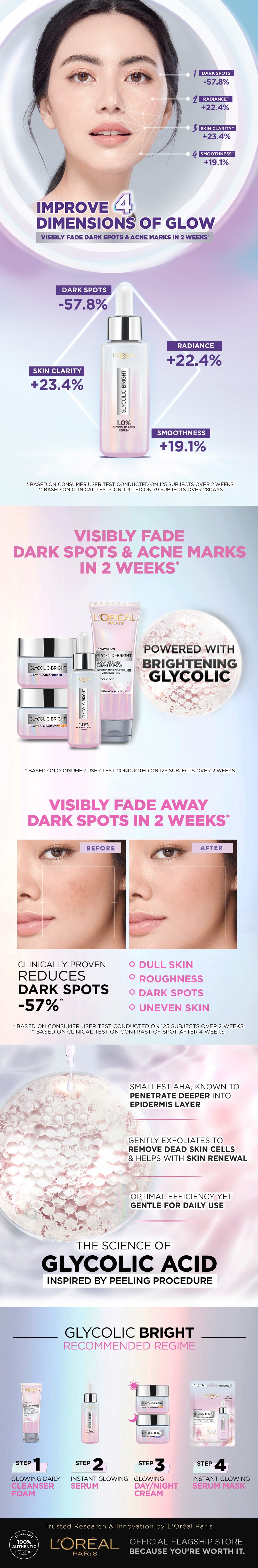 Glycolic Bright Glowing Night Cream with brightening Glycolic Acid have been tested by dermatologist & proven on Asian skin tones, clinically proven to intensively repair skin barrier and reduce dark spots. Contains encapsulated beads, this exceptional formulation with brightening Glycolic acid and anti-oxidant Vitamin E helps fight the appearance of dullness throughout the night, for visibly even glowing skin.