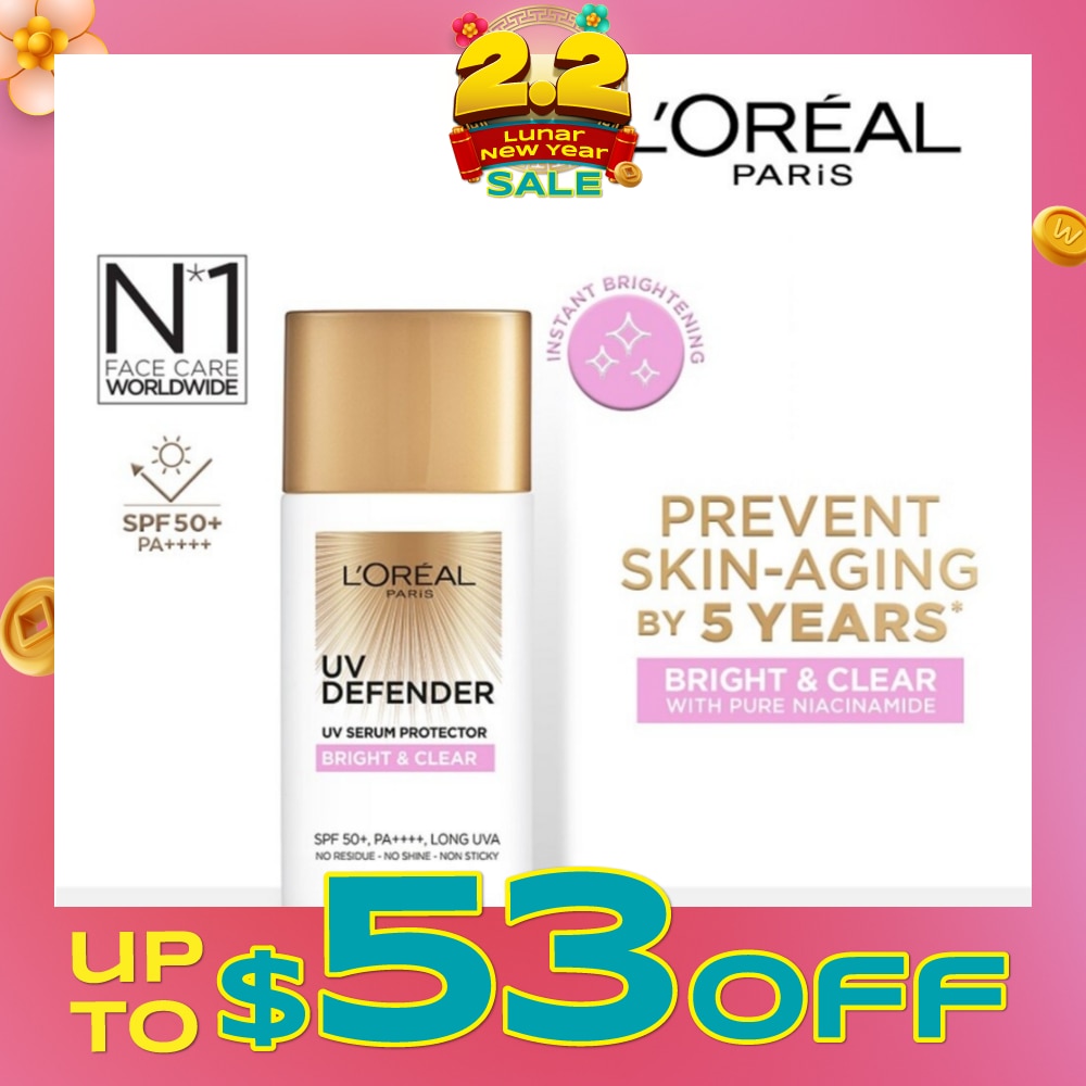LOreal Paris UV Defender- Bright & Clear UV Serum Protector comes with skin brightening ingredient Niacinamide for instant skin brightening. Immediately, skin is brighter and protected from UV rays.