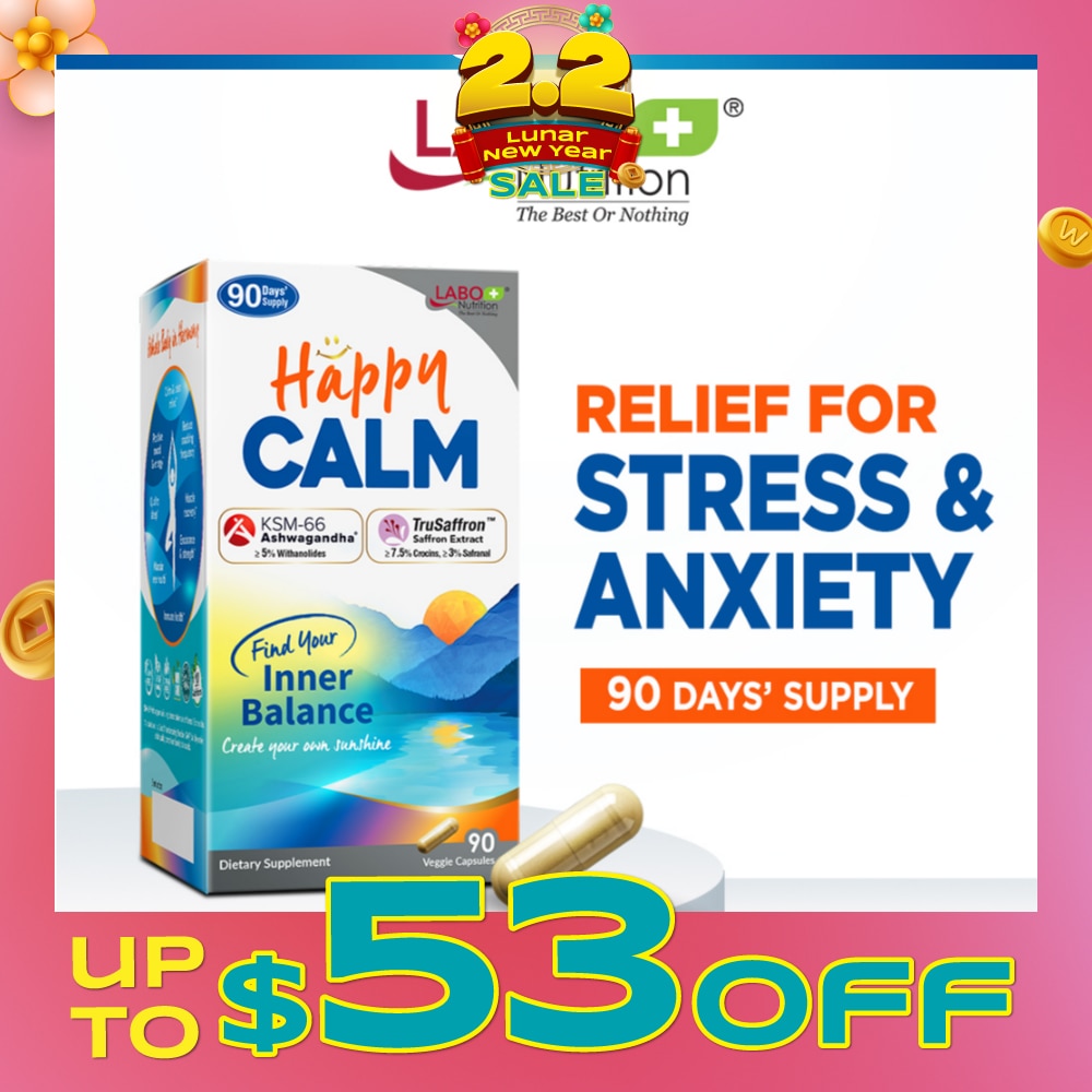 LABO NUTRITION Happy CALM Dietary Supplement Veggie Capsule (Ashwagandha & Saffron Extract To Reduce Stress, Relax Mood, Calm Brain, & Restful Sleep) 90s