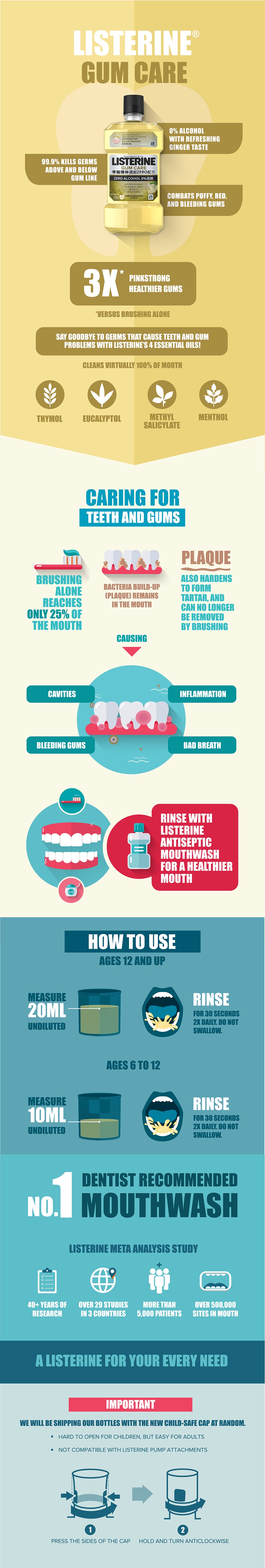 Adults and children above 12 years: Rinse with 20ml undiluted Listerine Gum Care Mouthwash each time, twice a day. Expel after rinse for 30 seconds and do not swallow. No further rinse with water is required