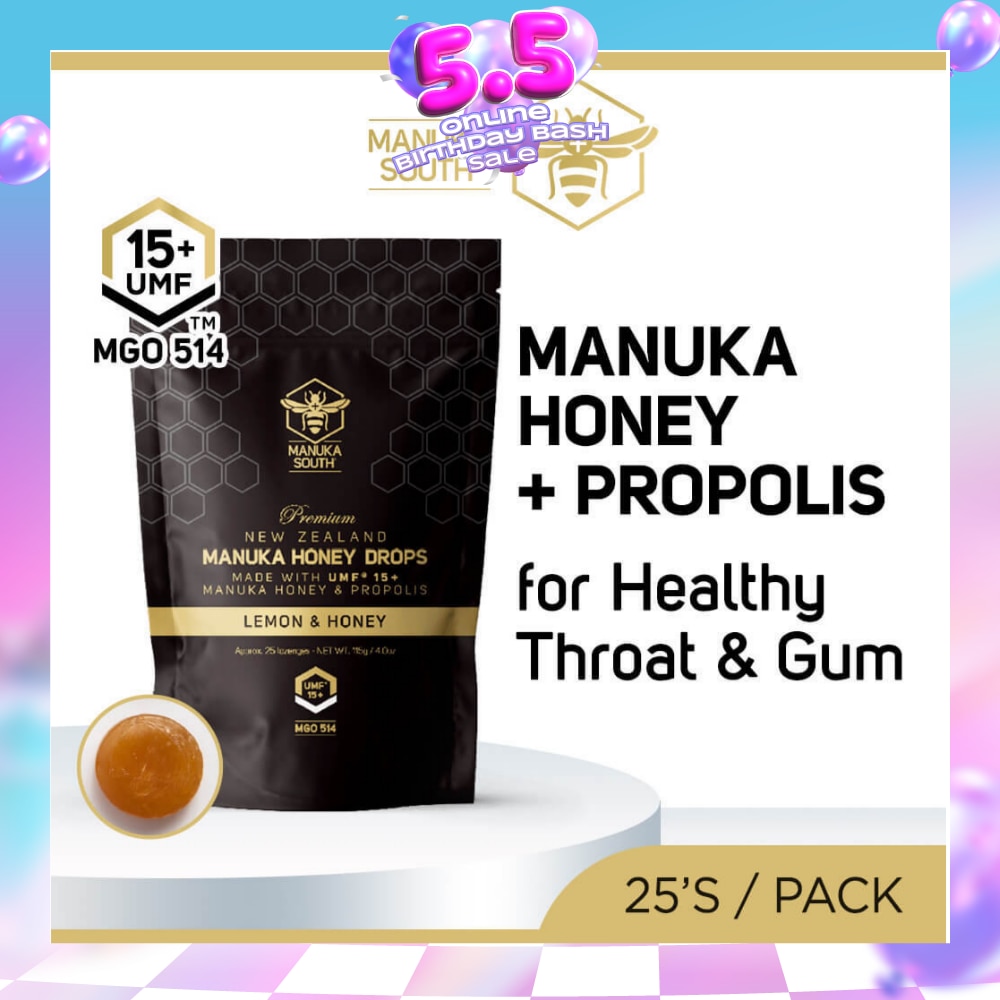 MANUKA SOUTH UMF15+ Manuka Honey DROPS with Propolis Lozenges (For Cough + Flu + Sore Throat + Ulcer + Gum + Bad Breath + Immunity Support) 25s