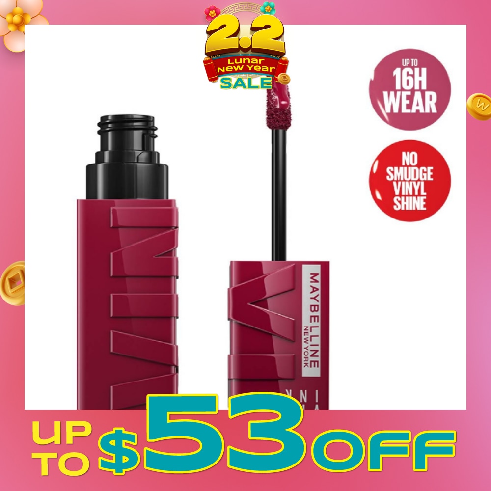 Meet Super Stay Vinyl Ink Longwear Liquid Lipcolor for no smudge vinyl shine color and up to 16 hour wear. This longwear lipstick’s Color Lock formula defies smudging and transfer and provides an instant shine finish. Shake before applying on clean, dry lips. Available in 5 vinyl shades.