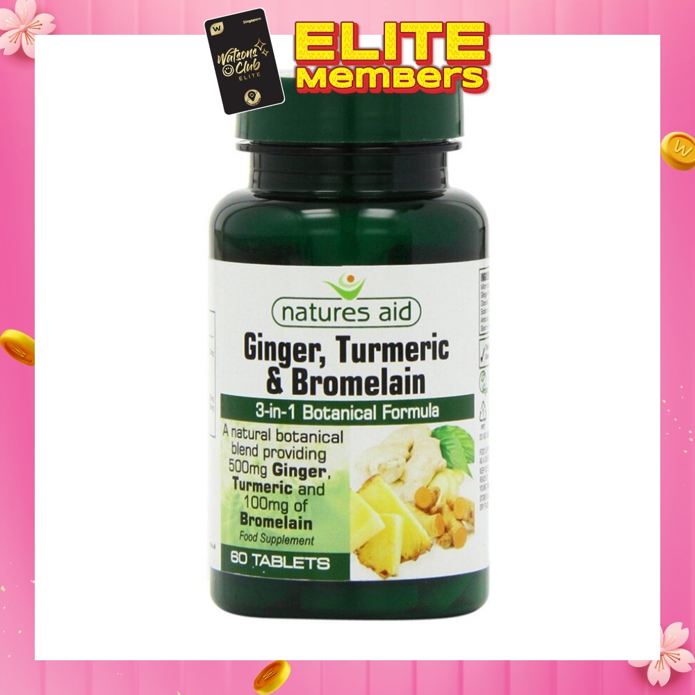 A synergistic formula combining three remarkable botanical ingredients into one tablet. Ginger Ginger has a long history of use, spanning back over 2,500 years). There has also been a lot of interesting research carried out on this fascinating herb, which indicate it could have up to 115 active components. Gingerols and Shogaols are the two with the most interesting reports. Turmeric Most of us are familiar with Turmeric as one of the principle ingredients in a curry. However, Turmeric is widely used in Chinese & Indian Herbalism and has been the subject of vast amounts of research in recent years. The active component in Turmeric is Curcumin, which is responsible for the spices distinctive yellow colour. Curcumin has been the focus of many reports and studies over the years. Bromelain These enzymes are reputed for their ability to digest proteins and include a mixture of different compounds including phosphatase, glucosidase, peroxidase, cellulase and several protease inhibitors. Bromelain is non-toxic, clinical studies into its’ safety have shown that the body can absorb around 12g without any side effects. Natures Aid Ginger, Turmeric & Bromelain is a natural botanical blend providing 500mg Ginger, 500mg Turmeric and 100mg of Bromelain.