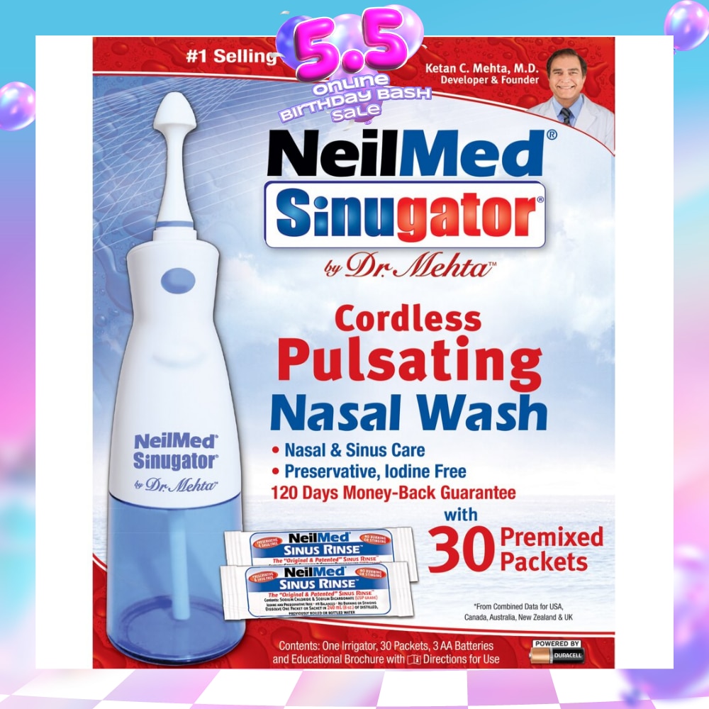 NeilMed Sinugator - Cordless Pulsating Nasal Wash with 30 Sinus Rinse Premixed Packets of USP Grade Sodium Chloride & Sodium Bicarbonate