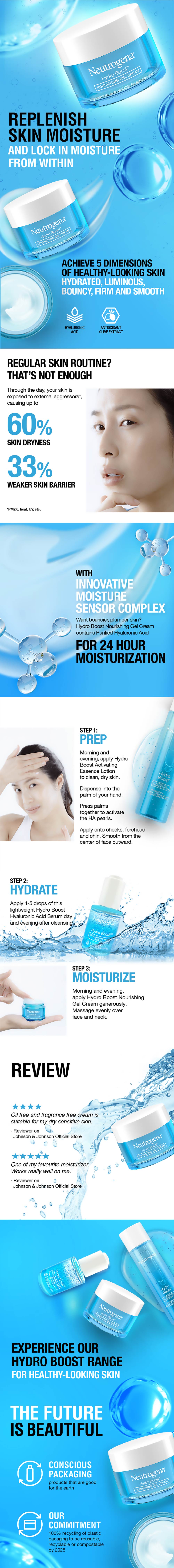 Neutrogena® Hydro Boost™ helps you achieve 5 dimensions of ideal healthy skin - hydrated, luminous, bouncy, firm and smooth. Our innovative Moisture Sensor Complex effectively replenishes moisture when you need it most while helping to repair and rebuild skin barrier to lock that moisture in.
