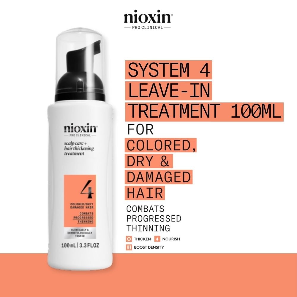 Nioxin System 4 Leave-In Treatment is designed for color-treated hair with progressed thinning. Clinically and dermatologically tested.