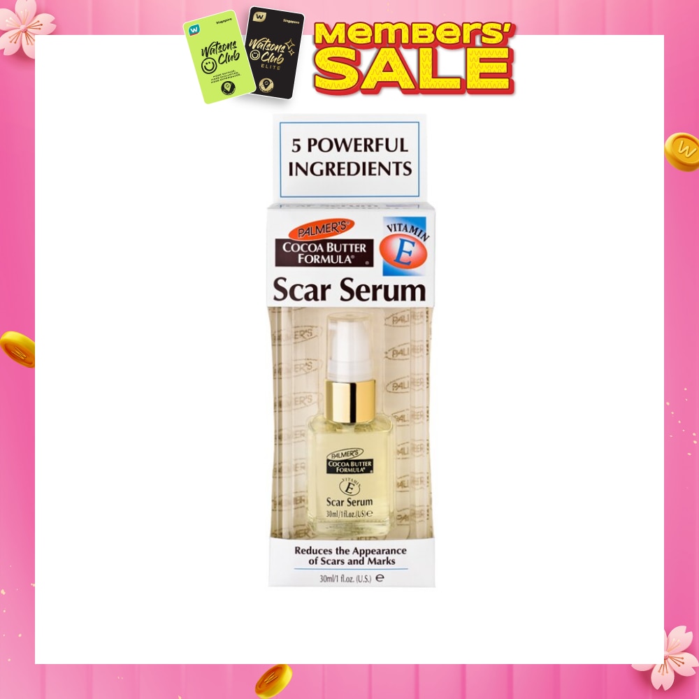 PALMER'S COCOA BUTTER FORMULA VITAMIN E SCAR SERUM COMBINES 5 POWERFUL INGREDIENTS OF SCARS RESULTING FROM SURGERY, INJURY, BURNS, STUBBORN STRETCH MARKS, C-SECTIONS, CUTS, CHICKEN-POX SCARS, INSECT BITES.