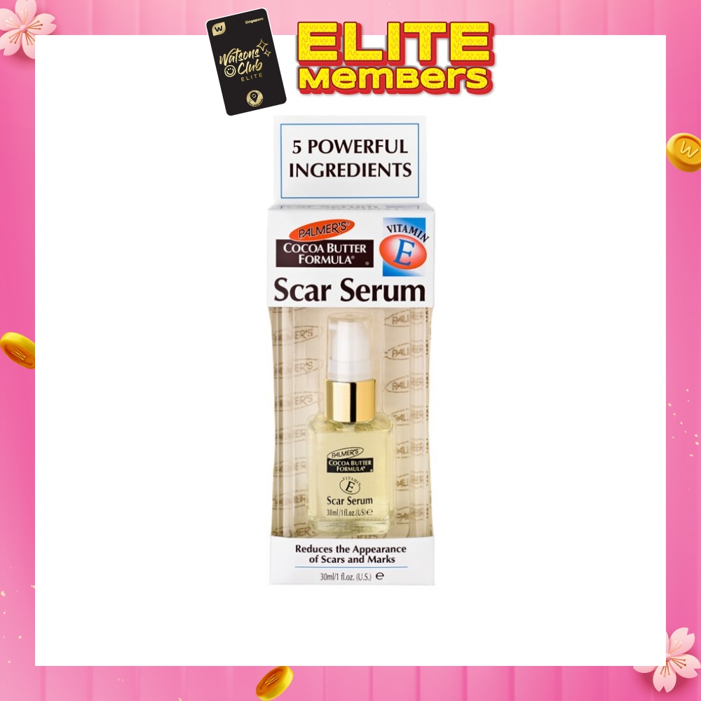 PALMER'S COCOA BUTTER FORMULA VITAMIN E SCAR SERUM COMBINES 5 POWERFUL INGREDIENTS OF SCARS RESULTING FROM SURGERY, INJURY, BURNS, STUBBORN STRETCH MARKS, C-SECTIONS, CUTS, CHICKEN-POX SCARS, INSECT BITES.