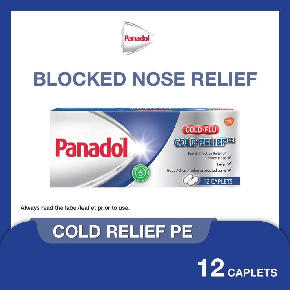 Panadol Cold + Flu (Cold Relief PE) Caplet is a non*drowsy formula for fast and effective relief of cold and flu symptoms. Helps to relieve fever, headaches, body aches and blocked nose. Caplets are oval shaped and film-coated, making them easier to swallow and leaving no bitter aftertaste.