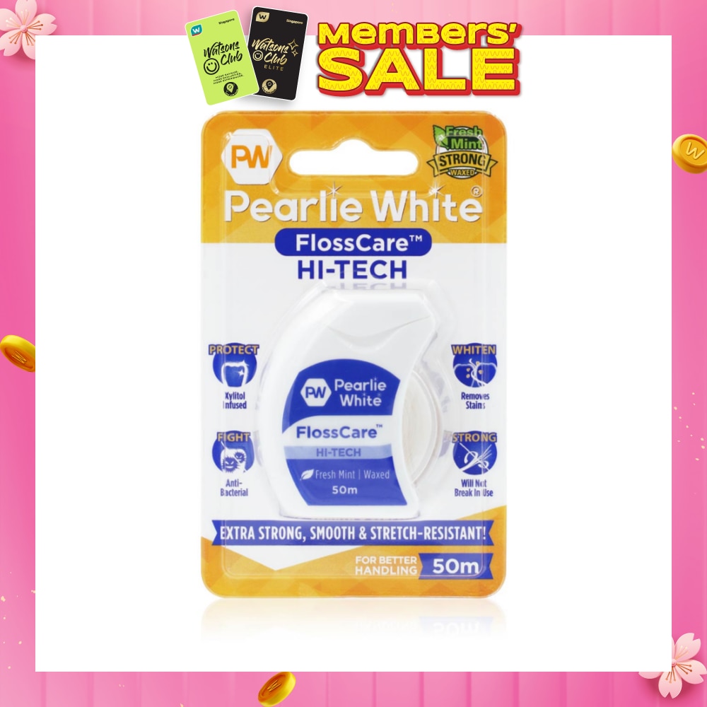 Pearlie White FlossCare Hi-Tech Waxed Fresh Mint Dental Floss has a unique ultra-wide floss design covering more of each tooth. Practically unbreakable and slides easily around tight spaces and sharp edges. Doesn not stretch during use, perfect for floss holders.